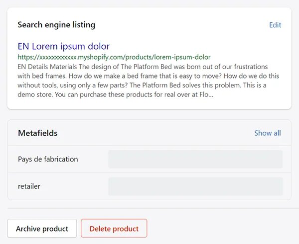 Si tout cela vous semble obscure, pas de panique ! C'est en général nous qui nous occupons de la mise en place de ces différents éléments. De votre côté, vous n'avez qu'à remplir les différents champs au sein de vos fiches produits en bas de page de ces dernières :